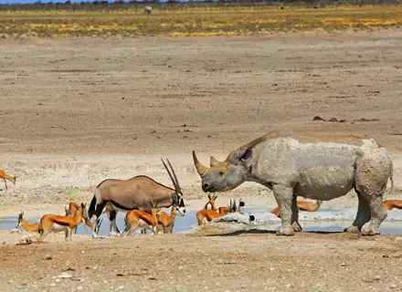 A full day in the Park lies ahead of us. Except for the rainy season, Etosha’s animals are depending on artificial waterholes and natural springs. Explore the various waterholes along this enormous saltpan, which is called the “great white place of dry water” in a local language. Lunch stop at one of the rest camps (lunch excluded). Encounter the big variety of wildlife in the Park during the course of the morning. More than 114 mammals species are found in the Park, several of them are rare and endangered like the black rhino of the black faced impala. You have a great chance of seeing some of the bigger mammals, like elephant and rhino and of course a highlight in any safari, the predators.