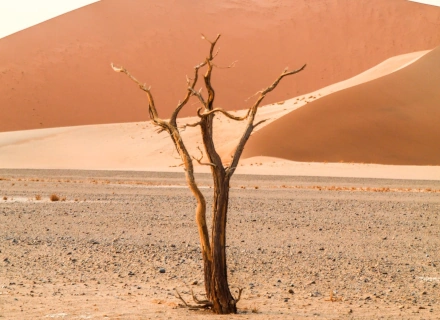 An early start to capture the soft light of sunrise over the desert. After passing through the Sesriem Gate, we continue towards Sossusvlei, with sand dunes stretching along both sides of the road in the distance. We stop at the famous Dune 45. Those feeling energetic can climb the dune and enjoy breathtaking views of the surrounding desert and dunes.